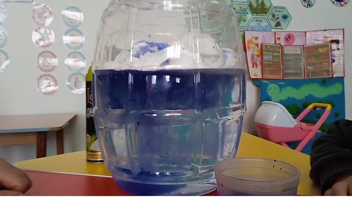 "Бейіс-Хазірет орта мектебі" КММ жанындағы шағын орталықтың орта тобының балаларымен "Бұлттан жаңбыр" тәжірибесі судың қасиеттерін — қырыну көбігі арқылы бояп дәстүрлі емес әдіспен зерттеуге бағытталған.