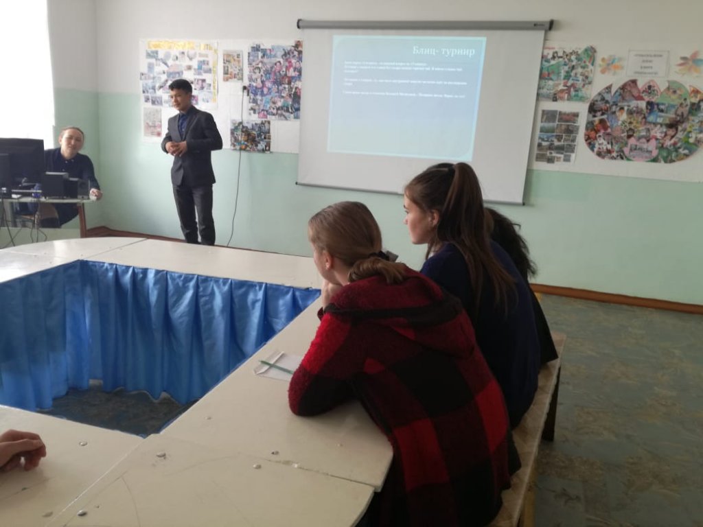 2019 жылдын 17 сәуір кіні мектебімізде математика мұғалімдері Нурпеисов С.Д и Оспанова Н.К 8-9 сынып оқушылар арасында «Не? Қашан? Қайда?» іс-шара өткізді. Ойын өте қызықты өтті. Ойын бабында оқушылар көп жақсы әсер алды.