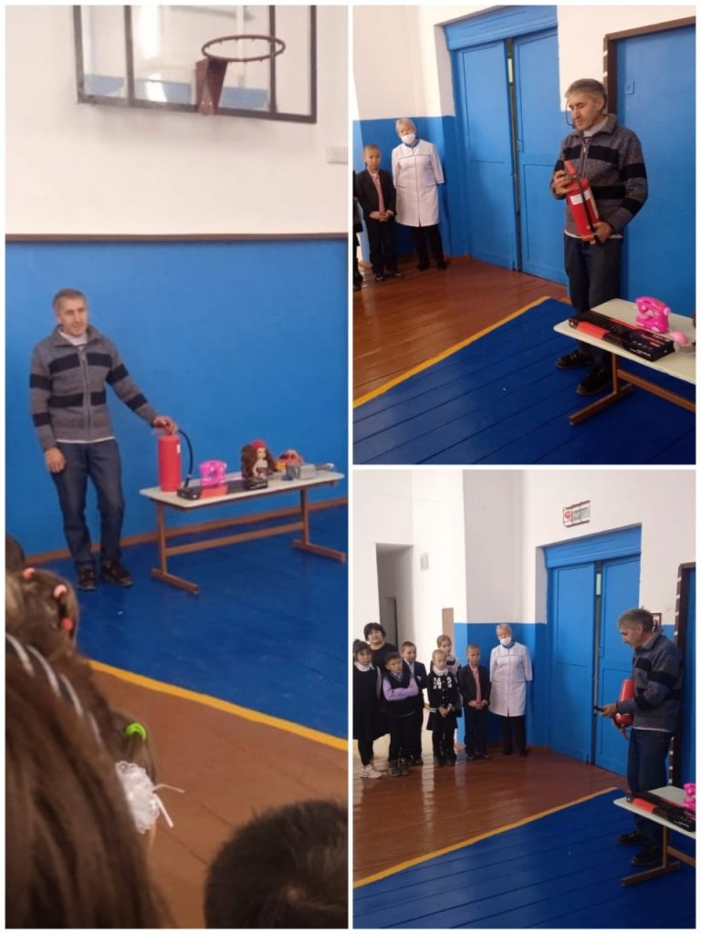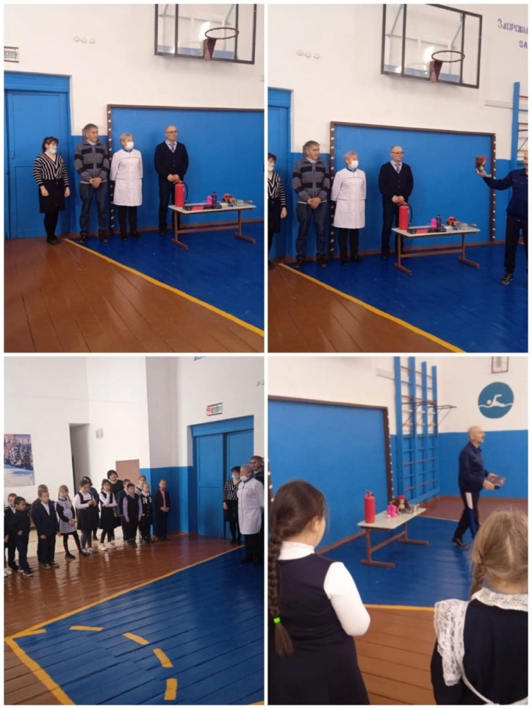 В. А. Мельников мектебінің завхозы қауіп пен өрт туындаған жағдайда қандай нөмірге қоңырау шалу керектігі туралы айтып берді. Сондай-ақ, өрт сөндіргішті қалай дұрыс пайдалану керектігін көрсетті.